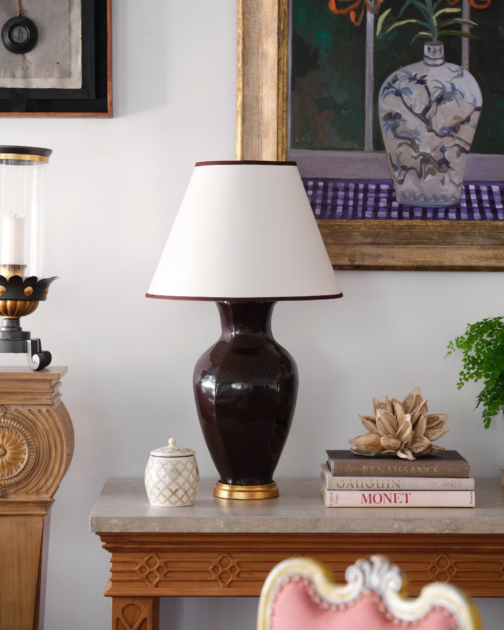 A cream colored hard-backed fabric empire shade with brown trim – an easy way to bring together similar colored elements in the room. Scaled to work on nearly all of the Bunny Williams Home table lamps.